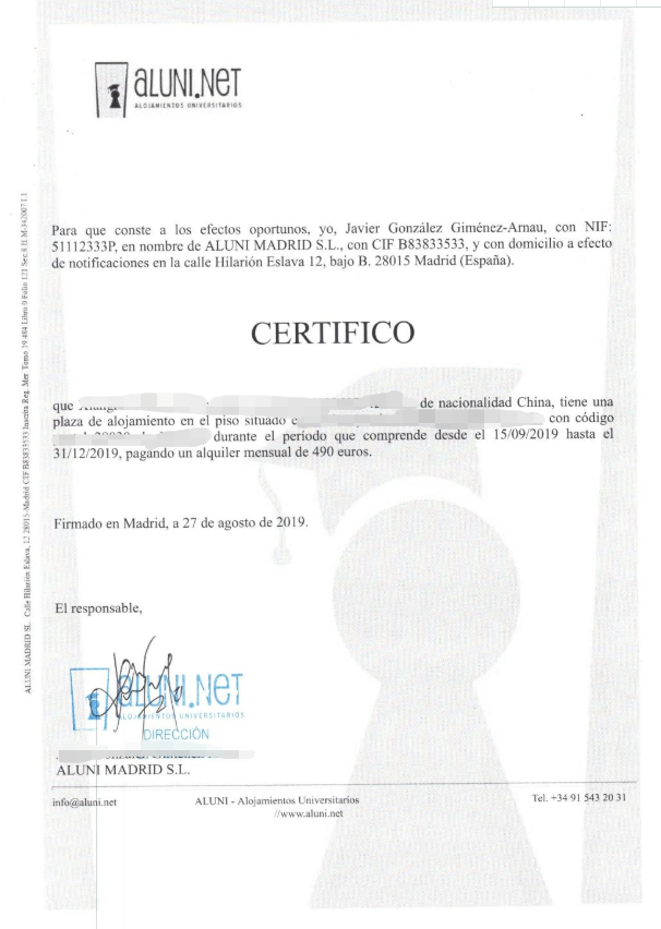 - 找能直接提供住宿证明的租房机构租房。学姐两次申请西班牙签证和居留,都是在Aluni这个租房网站上租的房子,用的他们家的住宿证明(两次都100%安全通过)。这家机构只租房给学生,且对房东和房屋的质量有严格的标准。算是比较安全放心的租房中介。大家在上面租好房子以后,可以向工作人员索要一份住宿证明,每份需要缴付45€。